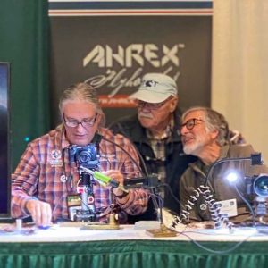 Famed fly tiers Bob Clouser (center) and Orvis’ Tom Rosenbauer (right) watch recently-named Fly Tier of the Year Tim Flagler demonstrate a new fly tying technique.
