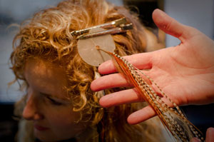 The idea took off in and around Boulder, Colorado, but has since spread to California and elsewhere. They are called Feather extensions… extensions bonded with carotene wax. Cost is $5 for one feather, and up to $25 for 5-7 feathers. (You do the math to value a typical cape of feathers in a busy salon.) The more expensive versions are called “couture” feathers and feature the best hackle available… hence the sudden massive demand for fine feathers. The extensions last in hair for about 2 weeks (cold fusion), or up to 2 months for the hot fusion variety.