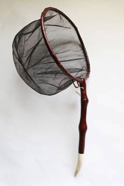 The end of the net features a deer antler. In Japanese angler superstition, it is said the deer antler protects a person in the water. It’s an amulet for good luck and protection. Many nets feature this, it’s a nice detail, but also serves the function of making it easier to slip it into your belt.