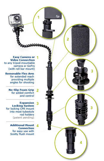 Developed by sustainable fishing company GreenFish, the CPR Mount’s Expansion Lock technology fits most rod-holders, providing a stable platform for taking photos or capturing video. Its universal camera mount fits most digital cameras and the GoPro. The Flex Arm lets you position the camera to film the action from multiple angles– even underwater.