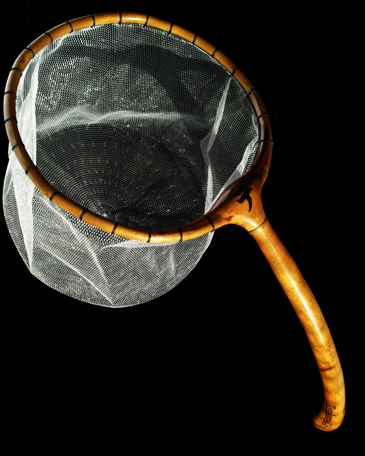 We have improved the design of our original tenkara nets and added a new size to the lineup: now available in 9inches or 10.5 inches diameter. Our tenkara nets feature the original design of traditional tenkara nets, with the frame positioned at an angle from the handle and a super fine mesh (2mm). The angle makes tenkara nets not only unique and exquisite, but also highly functional, and the fine mesh offers several advantages to angler and fish. The angled net allows you to position it on your back, through the wading belt, while the net stays off your back and allows for free movement. When fishing in shallower water you can press it behind your knees after you net a fish so you can use both hands to manage the fish, or take a picture. It has become our favorite picture-taking device. If in deeper water, you can also leave the handle through your wading belt on your side as you have both hands free to unhook the fish or take a picture. The round handle also ensures you can position it between your legs, or the positions mentioned above, and it won’t turn. In sum, a very well designed angler’s tool.