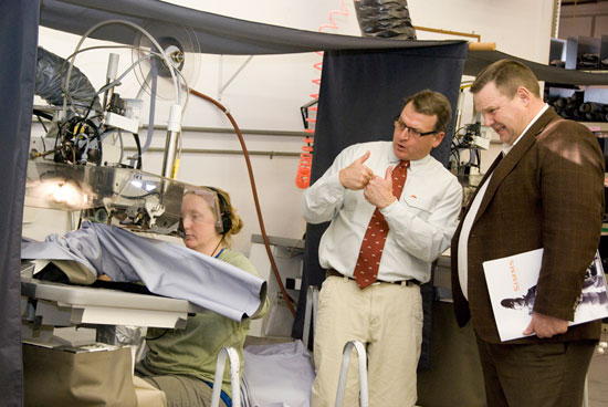 Tester said he was impressed with his tour of Simms, a 45,000-square foot campus with 101 employees. Simms continues to grow, and later in 2012 will move across town to a larger facility.