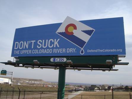 The billboard, in the foothills of Golden near the 470 exit, shows a state flag image being drained of water and warns, “Don’t Suck the Upper Colorado River Dry.” The message will reach an estimated 180,000 people each day who travel this major east-west corridor.