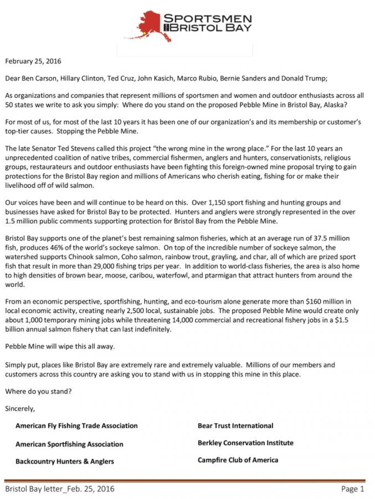Today, Sportsmen for Bristol Bay will be pressing the issue by presenting the candidates with the below letter. It will be interesting to see who responds, and how quickly they do so.