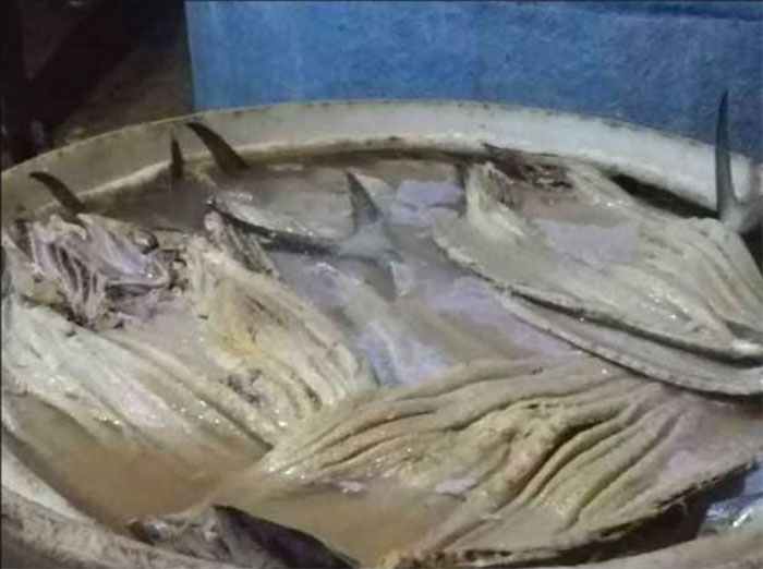 Photo Courtesy of the Belize Reporter – Vats of “salted” permit fish sit in barrels.