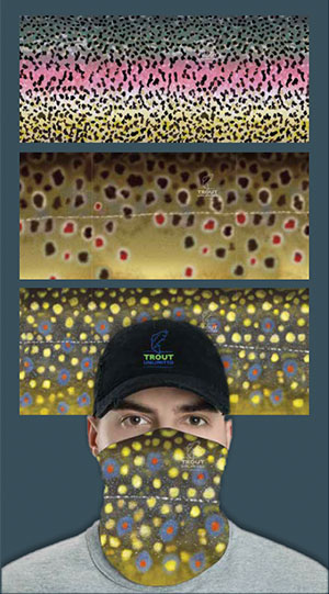 Trout Unlimted has produced a limited supply of special “Trout Skin” face coverings. With a donation of $37.50 (which includes shipping and handling), you’ll receive a set of 3 designs—brook trout, rainbow trout and brown trout. They’re 2-ply over the nose and mouth area, and shorter than usual neck gaiters. Mind you, these are not hospital-grade masks, rather the type we’ve been asked to wear in the grocery store (or if you’re sharing a boat with someone). They’re cool, comfortable, machine washable and very fishy looking.