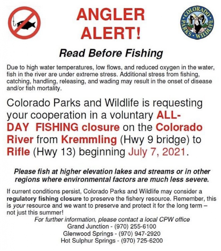 | KREMMLING, Colo. – Due to extremely low flows and warm water temperatures, Colorado Parks and Wildlife is asking anglers to voluntarily avoid fishing on the Colorado River between Kremmling and Rifle.