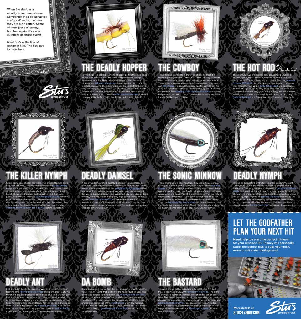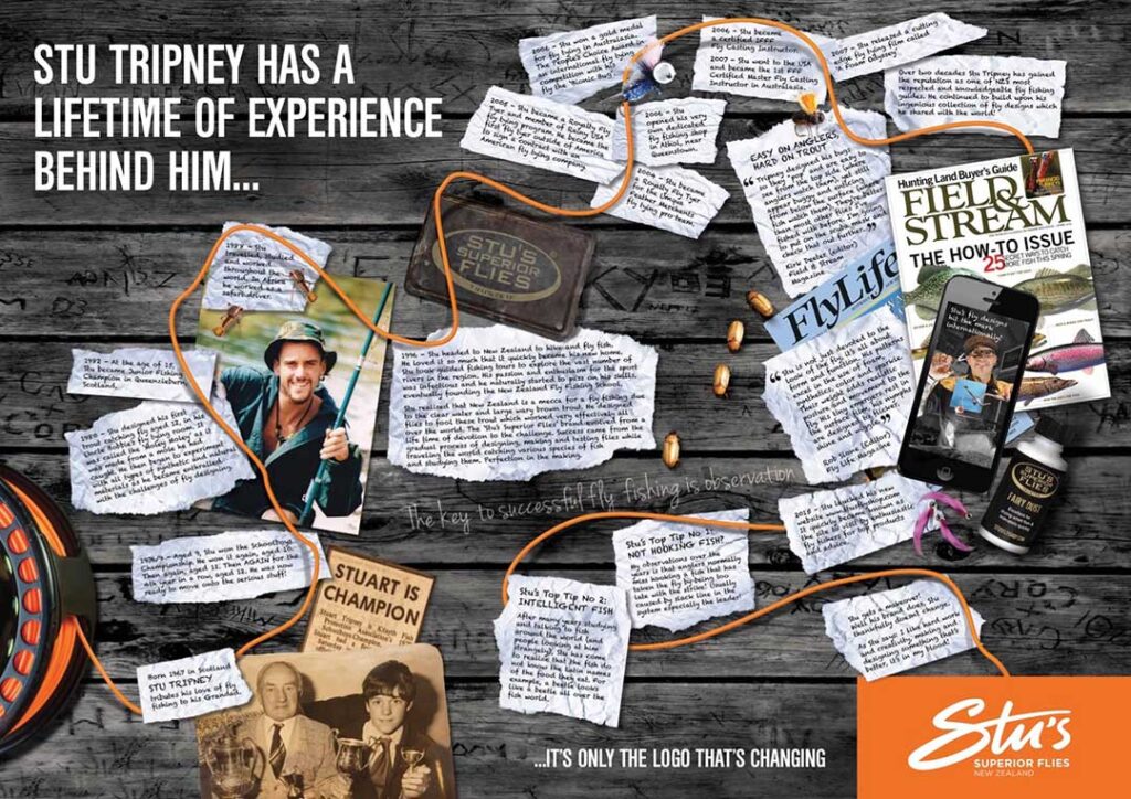 Stu’s Superior Flies Ltd. is a globally recognised, cool-as-chips, modern-day, fly fishing brand and is very, very unique. In a crusty mundane market, this brand is a known shaker and mover, a leader — definitely not a follower— this company/ brand, is seeking expressions of interest. An influential, premier fly fishing brand like this, soaked with decades of on-the-water and retail history, accolades, and design, rarely ever comes up for sale as a going concern. A reel fishy brand with huge and considerable untapped potential with one of the largest ranges of proven, unique fish-catching fly designs ever designed by one specialist fly designer in the world.