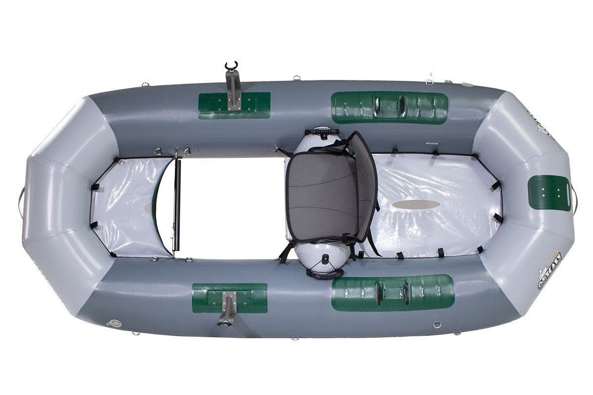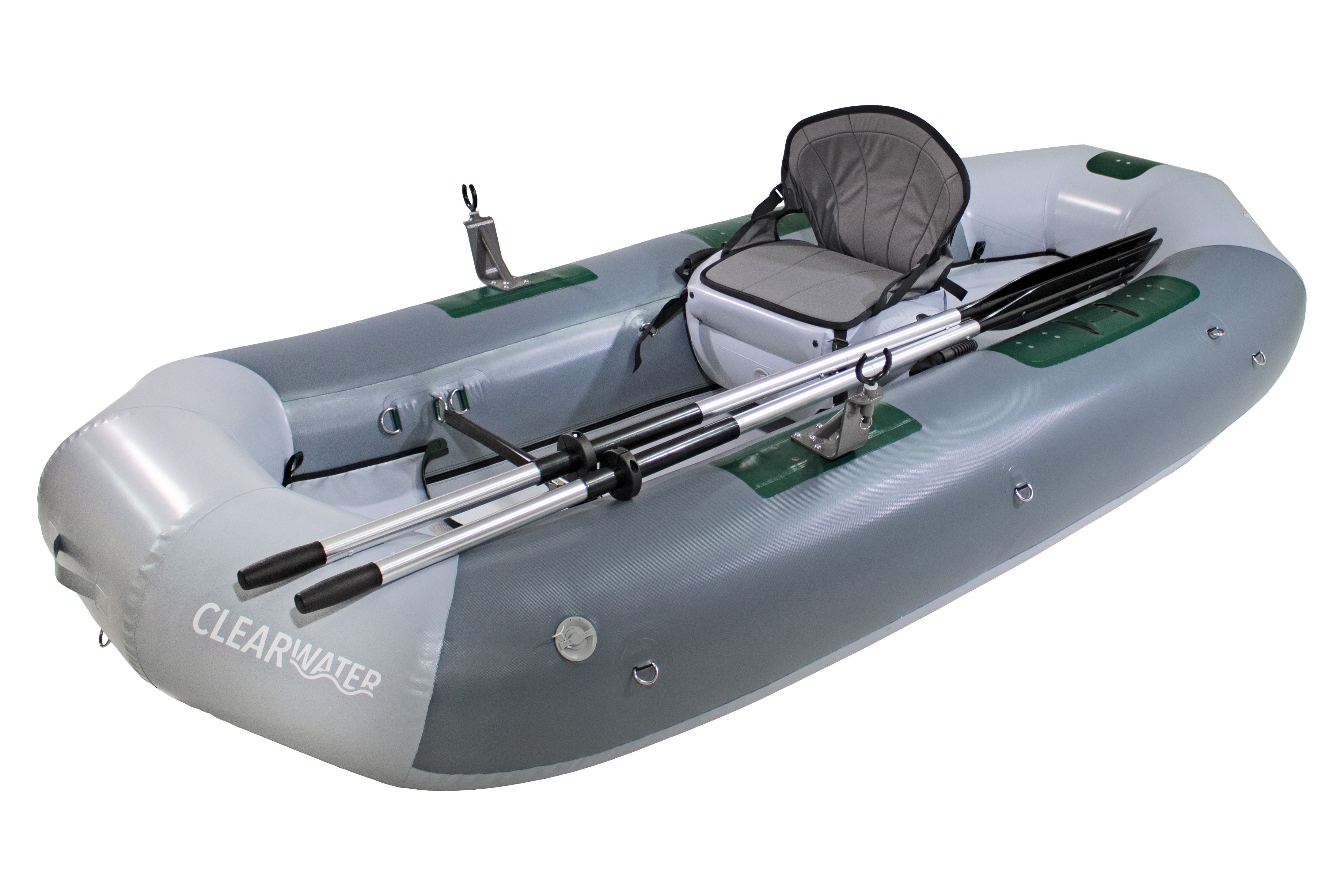 The OSG Clearwater is ready for big water and lots of gear. Using the open oarlock system, perfected on some of our multi-person rafts, it can accommodate longer/stronger oars for conditions when you need to put more oomph into your stroke. The Clearwater has a trampoline style cargo space in front and back for securing lots of gear. It has a 450 lbs load capacity but weighs in at just under 35lbs. The high-back seat rests on an inflatable thwart so the rower has great visibility and making it great for longer days on the water and even short expedition trips. Bonus, no trailer is needed and will fit in the bed of pick-up or can be car-topped for easy transport to your next fishing spot.