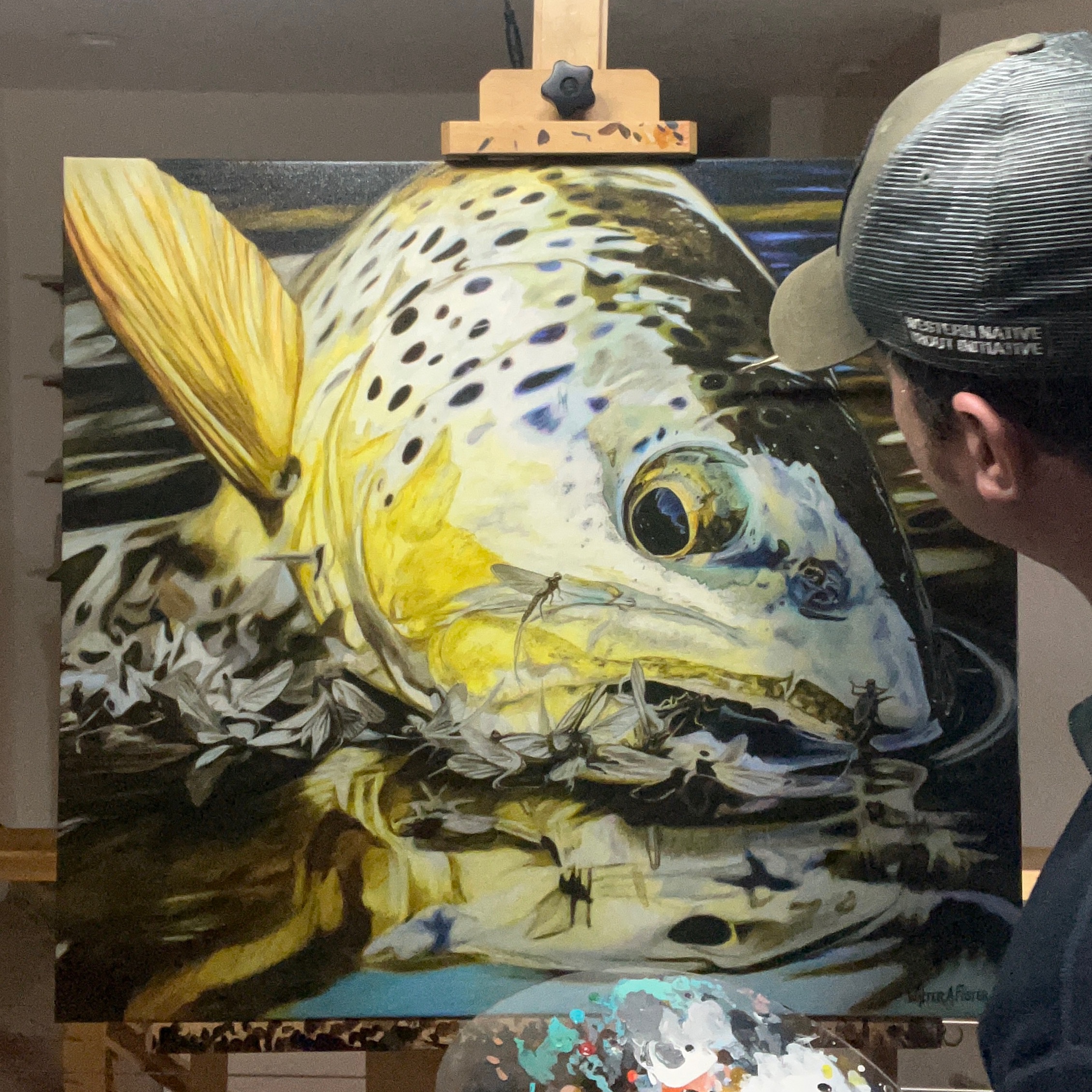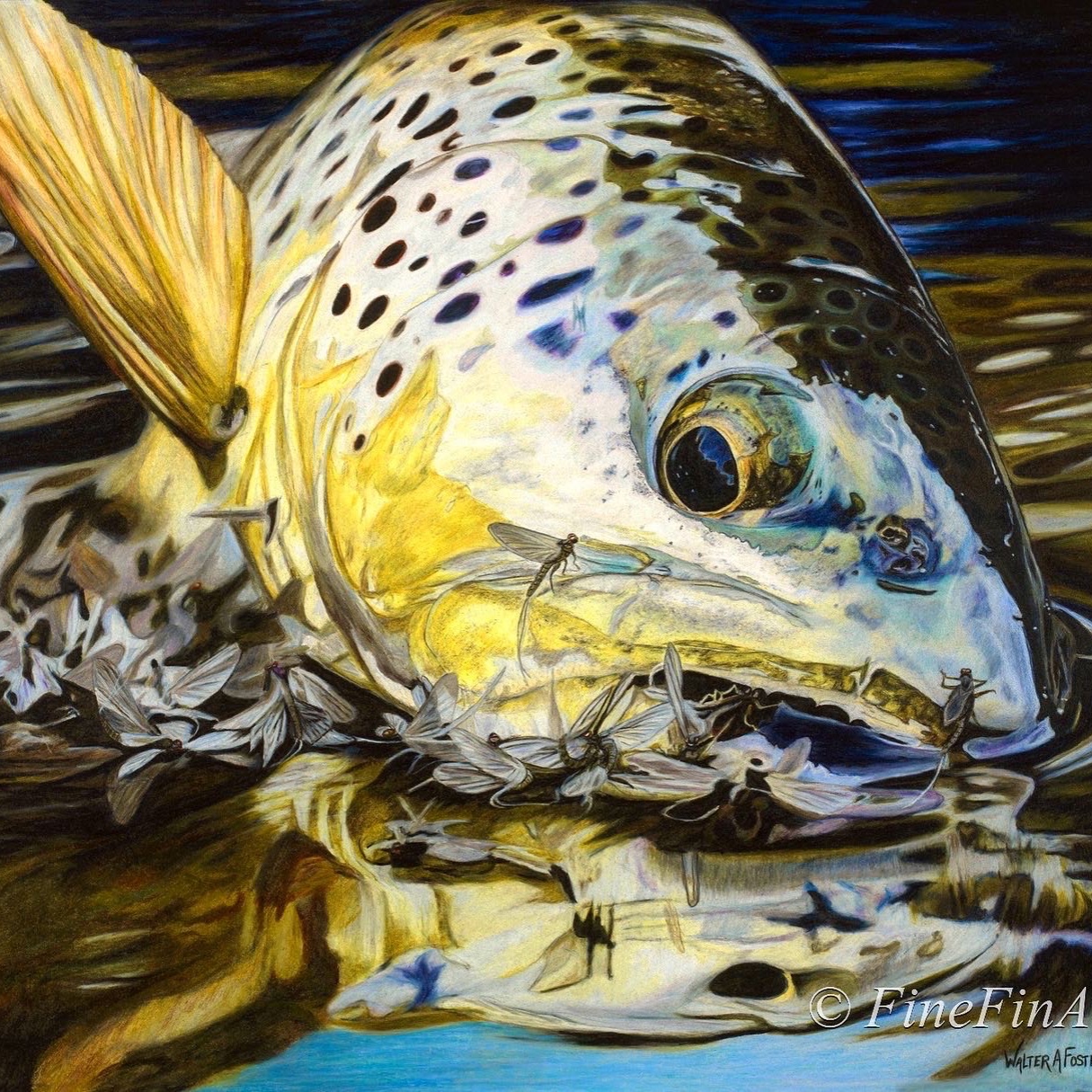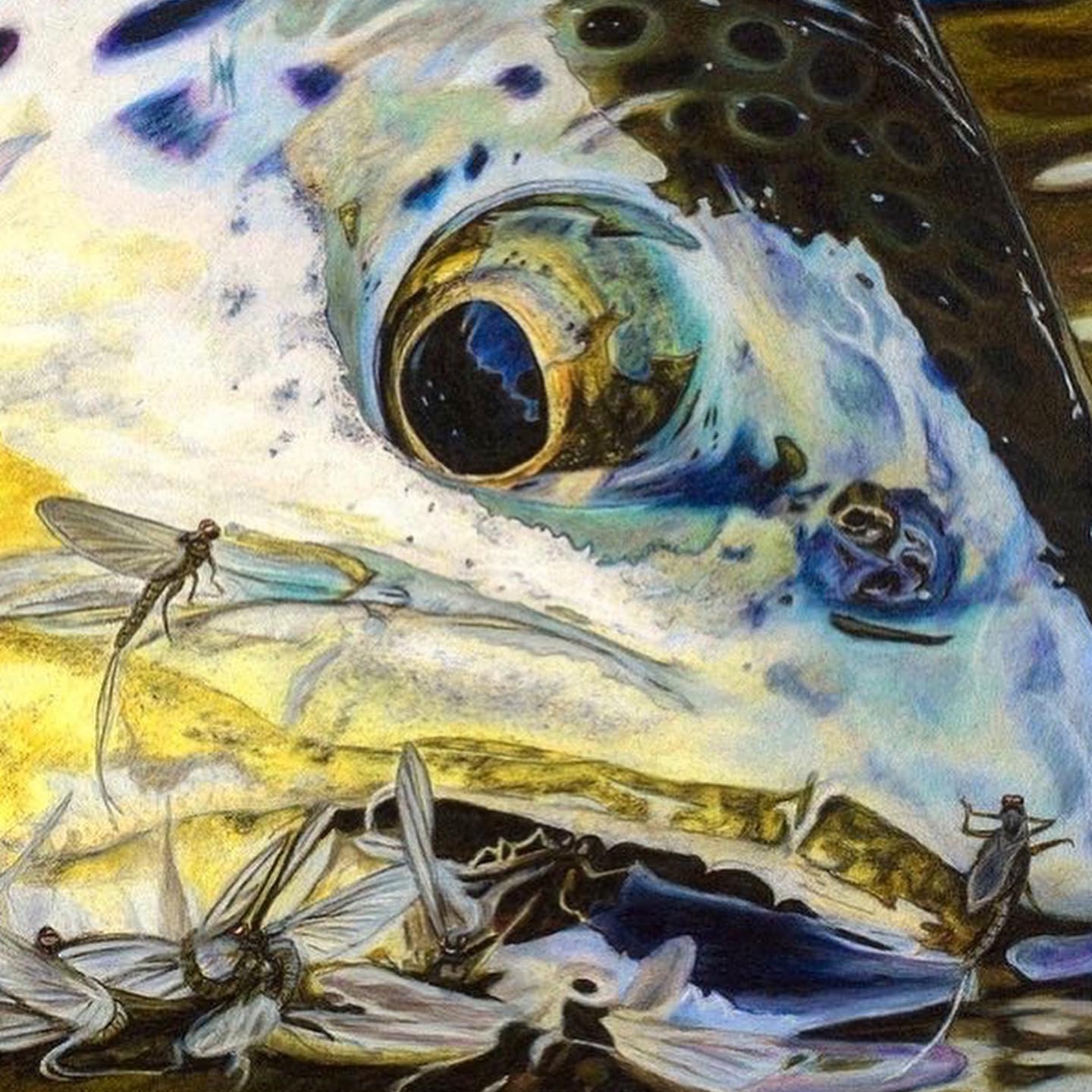 Painting, medium acrylic and oil pencil. Depicting a brown trout caught on Utah’s Green River during an epic blue wing olive hatch.