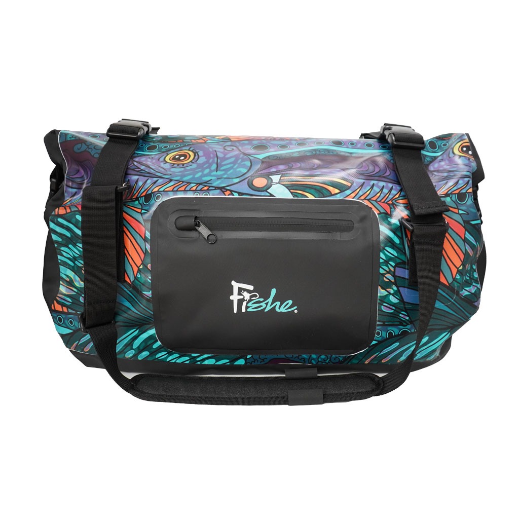 Our new duffle dry bag has even more carrying capacity with a whopping capacity of 66L and 100% waterproof construction. For easy accessibility to your items inside, there is a roll-top closure and quick-release buckles. For your smaller items, there is a splashproof exterior pocket for quick access. The attached strap is padded and can be secured together to be used over the shoulder or as a crossbody strap. Not to mention, our unique and vibrant Groovy Grayling print will certainly stand out from the sea of black luggage at the airport…