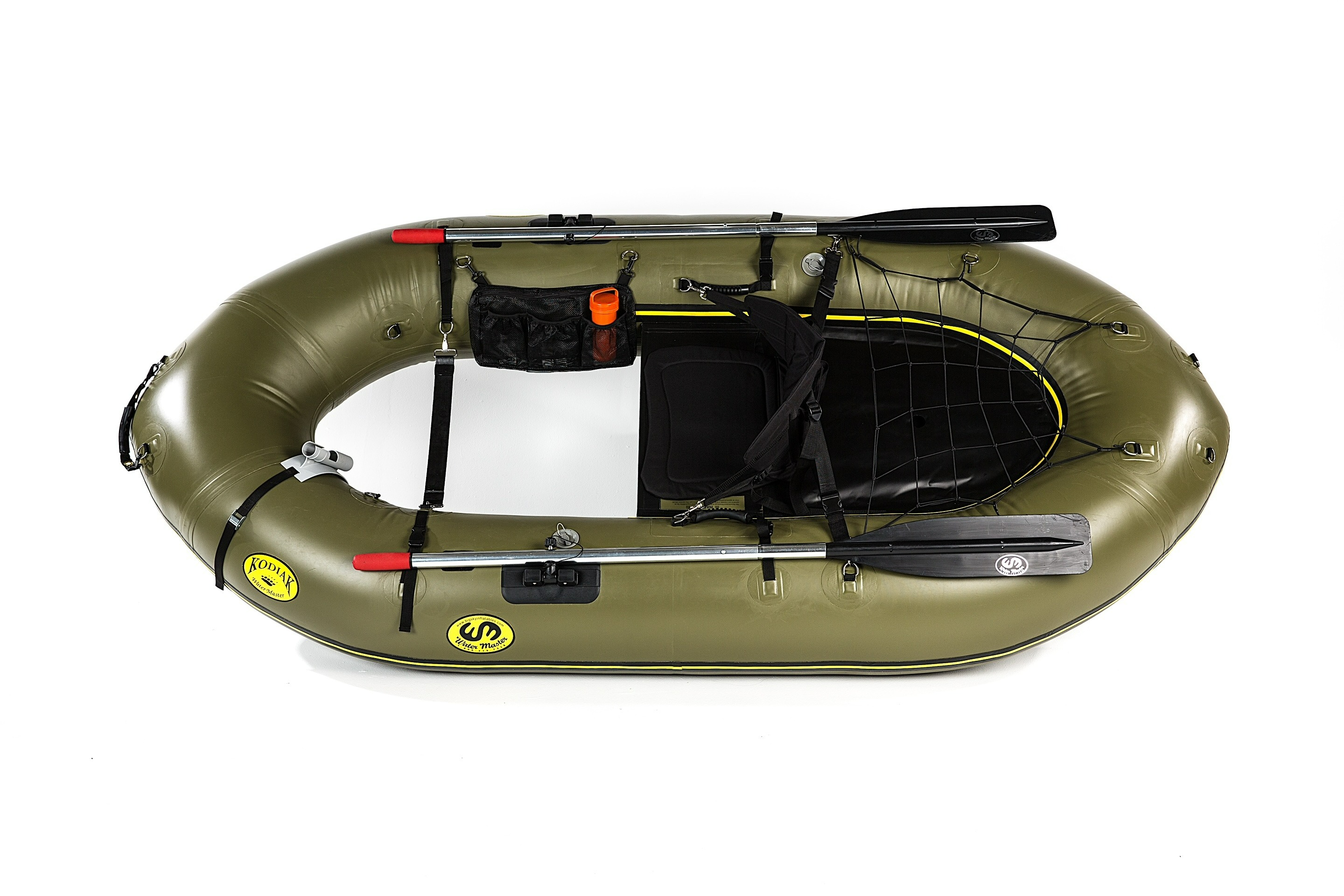 The Kodiak Raft Package was designed to meet the needs of our most demanding customers. The Kodiak Raft is larger than the Grizzly, and features a pointed bow and stern that increases stability, weight capacity, and rowing efficiency. The Kodiak Raft features the same hardware as the grizzly and is delivered in the same 7 cubic foot dry bag backpack. They are a few pounds heavier but every bit as compact.
