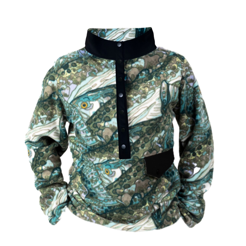 A classic and cozy fleece pullover designed with our NEW Steel My Heart pattern. FUNctional and cute, this layer is wonderfully versatile for all the adventures to come! The Riffle Snap Fleece Pullover is constructed from breathable, midweight polyester double-sided fleece. It features a 5 snap placket and fish-shape inspired front pocket flap. Pocket bag is roomy for all of your essential gear, wallet, keys, sunglasses and more. Soft stretch binding at stand collar, cuffs and hem is comfortable and moves with you.