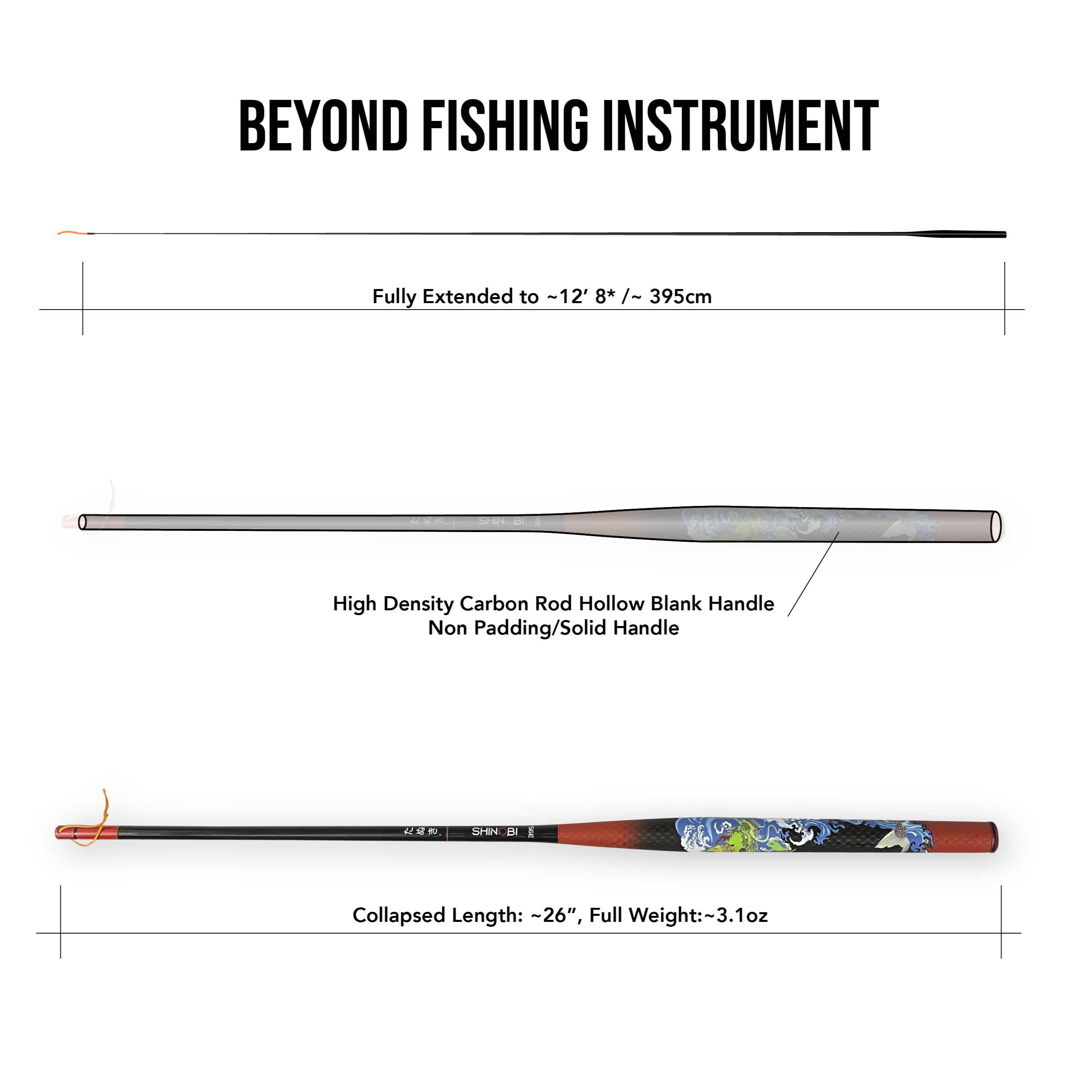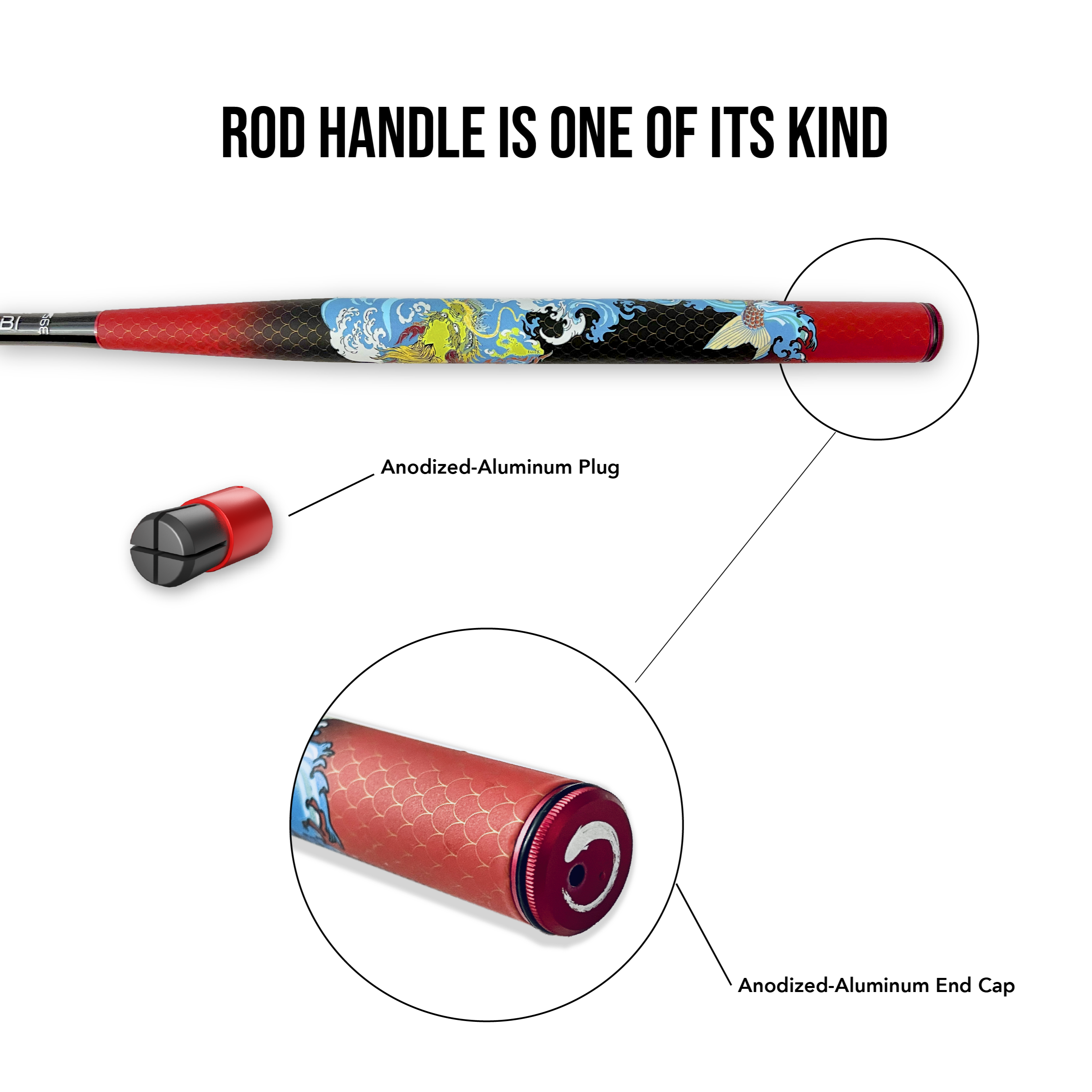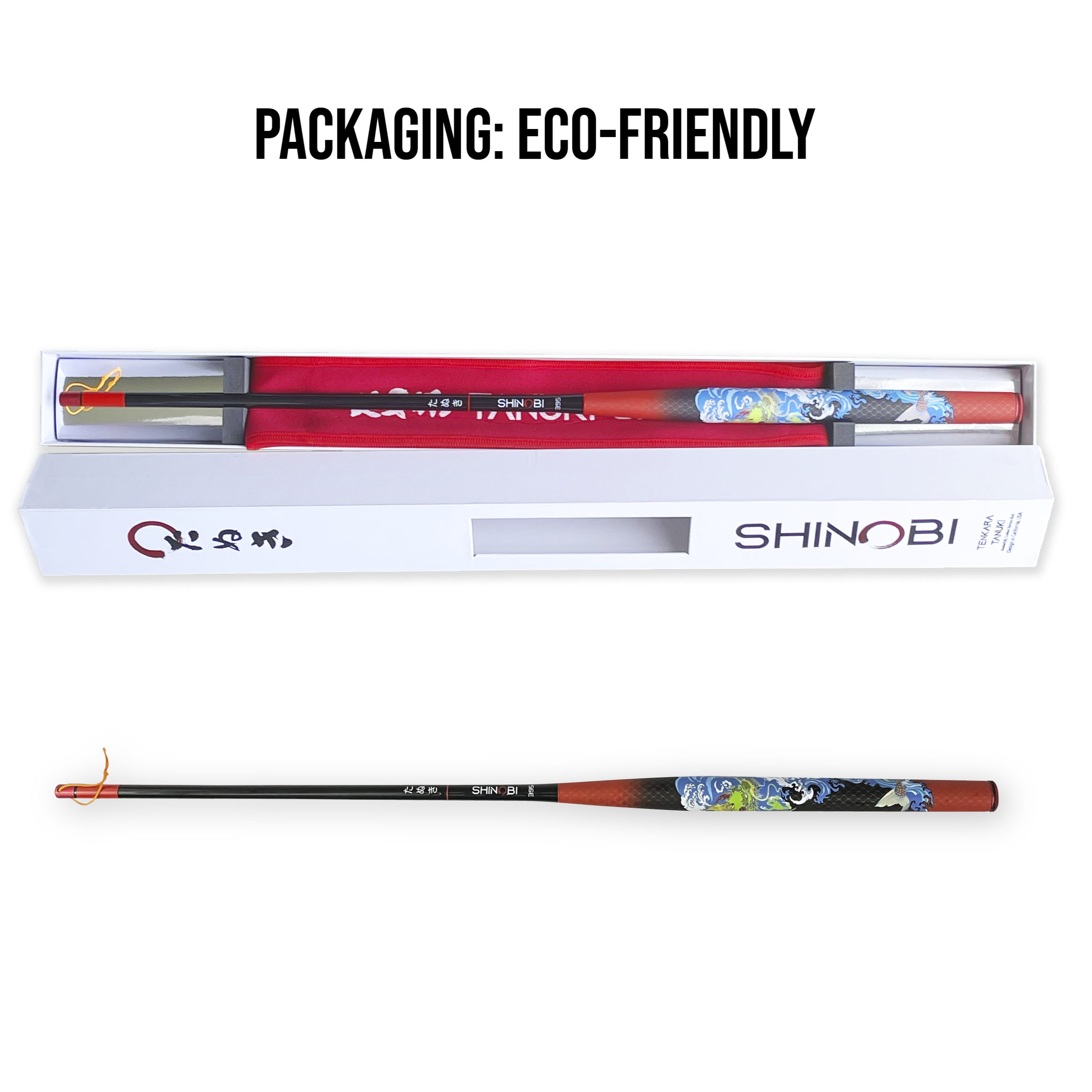 Tanuki Shinobi 395 is the first of its kind. The full rod is made with Japanese Toray high modulus carbon fiber, including the rod handle section for better sensitivity. The handle section “tattoo” with Japanese dragon and carp art. “The Shinobi is world class. “, Dr. Thomas Davis, Tetontenkara.blogpost.com ( https://bit.ly/384y5vw )